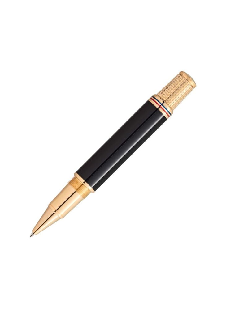 Sommige romans gaan de literaire geschiedenis in en staan tegelijkertijd symbool voor een heel tijdperk. The Great Gatsby van F. Scott Fitzgerald is zo’n voorbeeld uit de moderne Amerikaanse literatuur. De roman werd gepubliceerd in 1925 en schetst een fascinerend beeld van de Jazz Age en de Roaring Twenties, een tijd van ongekende rijkdom en zelfverwennerij. Het bruisende New York City, de weelderige landhuizen in Long Island en de duizelingwekkende high society feestjes vormen het decor voor het verhaal van Jay Gatsby, een mysterieuze miljonair die alles op alles zet om de genegenheid van terug te winnen van de verloren liefde uit zijn jeugd, Daisy Buchanan. De gekozen gestreepte stijl van de elite van het Gatsby tijdperk werd een modeklassieker voor succesvolle zakenmannen en vormt de inspiratie voor het ontwerp van de Great Characters Homage to the Great Gatsby Limited Edition 1925. Het gestreepte ontwerp van de dop van kostbare zwarte en witte lak harmonieert met het zwart gelakte lichaam van de pen. De schijnbare kracht van geld wordt in de pen gesymboliseerd door de goud gecoate clip die de vorm heeft van een geldclip. De dop van de pen is versierd met de initialen van Jay Gatsby in een ruitvormige, goudkleurige Art-Deco monogram. Het iconische Montblanc embleem is gemaakt van paarlemoer, waarvan de iriserende kleuren en glinsterende gloed de inspiratie vormden voor enkele van de meest elegante creaties van juweelontwerpers uit die tijd. De achterzijde van de pen in de vorm van een gegraveerde schroefdop verwijst naar het ontwerp van de vaak stijlvolle heupflacons van de Art-Deco periode. De fijne ringen in de kleuren van de Amerikaanse vlag eromheen staan voor de mythe van de Amerikaanse droom.