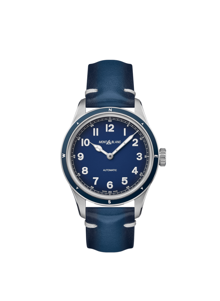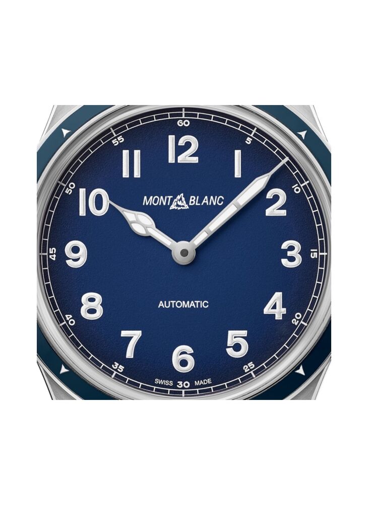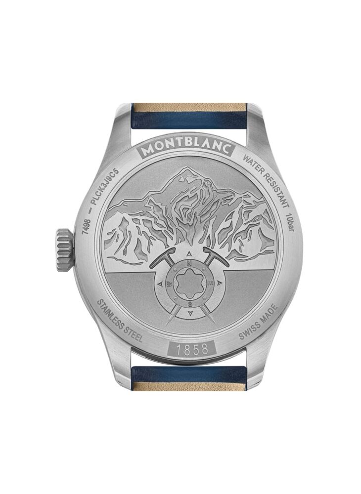 De Montblanc 1858 Collection is geïnspireerd op de legendarische professionele Minerva horloges uit de jaren 1920 en 1930, die werden ontworpen voor militair gebruik en verkenning. Door deze historische uurwerken opnieuw te interpreteren, geeft de Montblanc 1858 Collection een nieuwe uitdrukking aan de geest van verkenning in de bergen en de terugkeer naar de natuur. De Montblanc 1858 Automatic is een vintage geïnspireerde horloge met een blauw thema en heeft een roestvrij stalen kast van 40mm met slank gebogen wijzers met gepolijste en satijnen afwerking. Op de achterzijde van de kast is een afbeelding van de Montblanc gegraveerd met twee gekruiste ijspikhouwelen en een kompas. De Montblanc 1858 Automatic heeft een blauw Sfumato lederen polsband met witte stiksels.