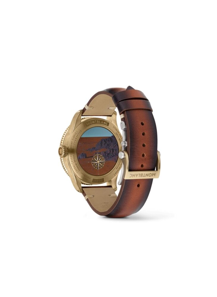 De Montblanc 1858 Collection is geïnspireerd op de legendarische professionele Minerva horloges uit de jaren 1920 en 1930, die werden ontworpen voor militair gebruik en verkenning. Door deze historische uurwerken opnieuw te interpreteren, geeft de Montblanc 1858 Collection een nieuwe uitdrukking aan de geest van verkenning in de bergen en de terugkeer naar de natuur. De Montblanc 1858 Geosphere Limited Edition 1858 is opgedragen aan de Seven Summits, de zeven hoogste bergen van de continenten, de heilige graal van de avontuurlijke bergbeklimmer. Het uurwerk heeft een 42mm bronzen kast gecombineerd met beige en bruine details geïnspireerd op de kleuren van de woestijn. Deze Limited Edition is voorzien van een wereldtijd complicatie ontwikkeld door de Montblanc horlogemakers in Villeret. Twee koepelvormige wereldbollen, draaiend in tegengestelde richtingen, die een volledige rotatie in 24 uur voltooien. Beide zijn omgeven door een schaal met tijdszones, samen dag en nacht indicatie in contrasterende kleuren. Het horloge is voorzien van een bruine Sfumato kalfslederen polsband met beige stiksels.