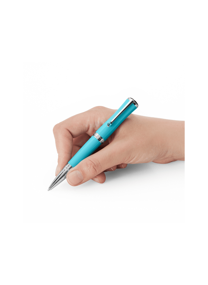 De Montblanc Muses Maria Callas Special Edition is opgedragen aan één van de meest charismatische sopranen van de 20e eeuw en een bewonderd stijlicoon: Maria Callas werd in 1923, in New York geboren uit Griekse ouders. Met haar talent, passie en persoonlijkheid belichaamde Callas een bepaald ideaal van de operadiva. Als jong meisje studeerde ze zang in Griekenland, waar ze het talent ontwikkelde dat ertoe zou leiden dat ze geprezen werd als “La Divina”, de goddelijke, in enkele van de grootste operahuizen ter wereld, La Scala in Milaan, Parijs en de Metropolitan in New York. Maria Callas bezat een stembereik van bijna drie octaven, waarmee ze alle traditionele definities van sopraanzang overtrof. Haar rijke stem was echter maar één facet van “La Divina”. Zowel op als naast het podium was ze een vrouw die wist hoe ze haar entree moest maken. De passie die haar optredens zo opwindend maakte, was net zo levendig als haar liefde voor Haute Couture, luxueuze accessoires en opvallende sieraden. Deze Muses Editie benadrukt één van haar favoriete kleuren, turkoois, gemaakt in kostbare hars. Terwijl de gracieuze schoonheid van Maria Callas weerspiegeld wordt in het slanke, elegante silhouet van de pen. De platinum clip van de pen is versierd met een synthetische steen waarvan de kleur doet denken aan het stralende turkooisblauw van de Egeïsche Zee uit haar Griekse thuisland. De bloemblad vorm van deze steen verwijst naar een roos die in 1965 naar de zangeres werd vernoemd, ter ere van haar grote liefde voor rozen. De gravure van laurierbladeren op de platinum ring op het lichaam verwijst naar een kostuumdetail van één van haar beroemdste rollen, Bellini’s “Norma” samen met de handtekening van de sopraan.