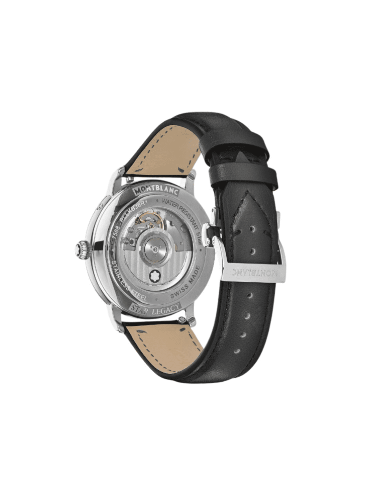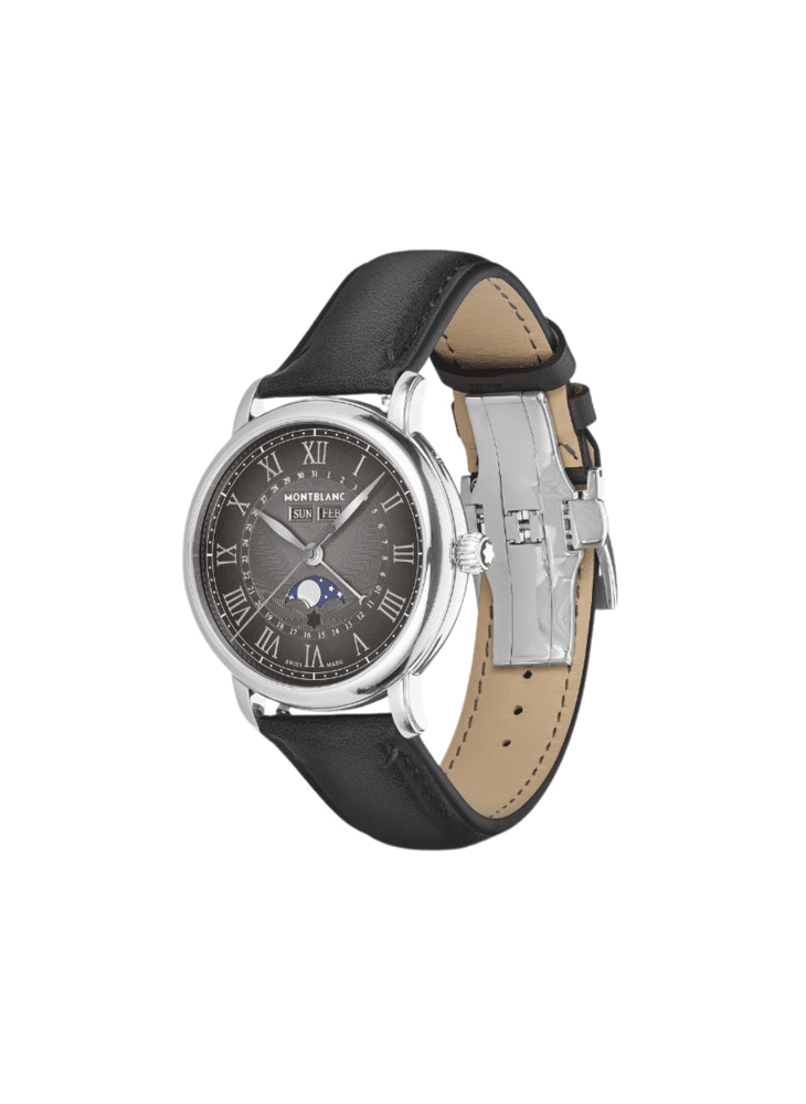 Tijdloze elegantie en hemelse precisie! Ontdek de perfecte harmonie tussen klassieke horlogemakers traditie en modern design met de Montblanc Star Legacy Full Calender. Deze verfijnde creatie in roestvrijstaal straalt pure elegantie uit met zijn 42mm ronde kast, een antracietkleurigewijzerplaat met een verfijnd exploding star guilloché-patroon, en Romeinsecijfers die tijd een nieuwe dimensie geven. Aangedreven door het automatische kaliber MB 24.30, biedt dit horloge een volledige kalenderfunctie inclusief dag, datum, maand en een poëtische maanfaseweergave. De open achterkant onthult het vakmanschap binnenin. De antracietkleurige verwisselbare kalfsleren band is geïnspireerd op de puntige vorm van de Montblanc penpunten, versterkt met een verticaal sfumato effect zorgt het voor een luxueuze draag ervaring. Voor wie stijl,traditie en innovatie wil verenigen in één meesterwerk.