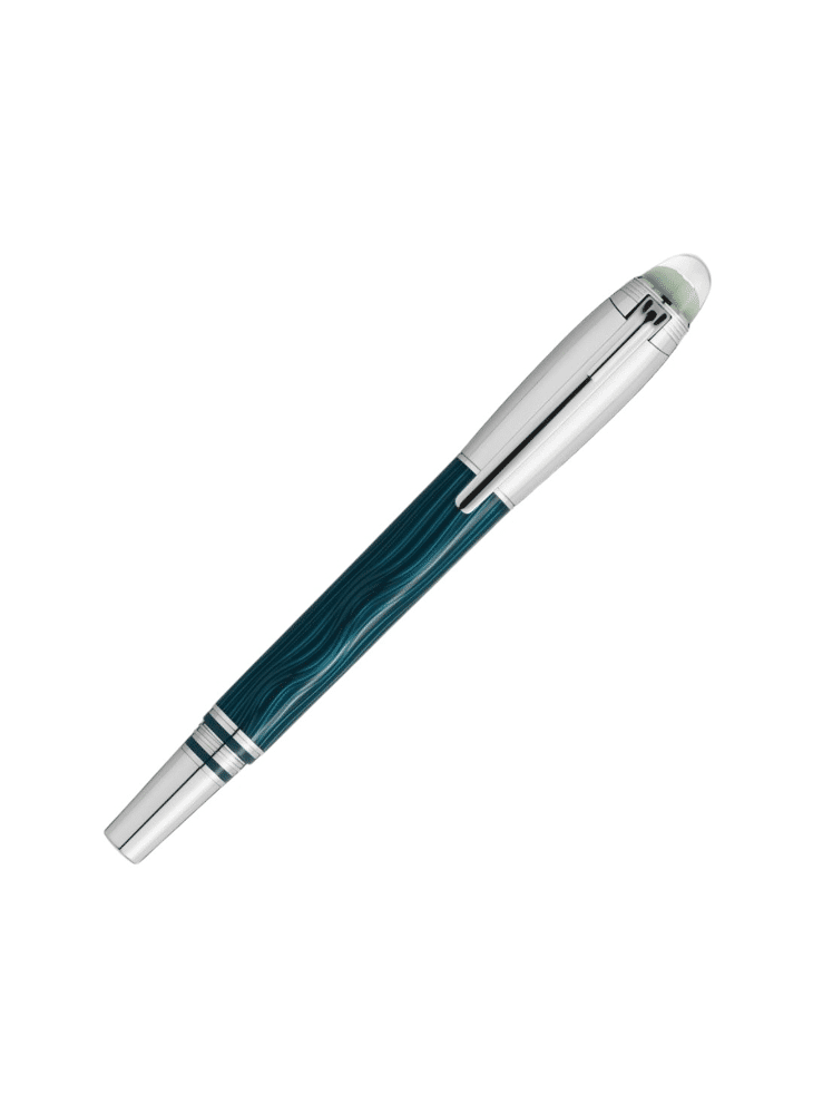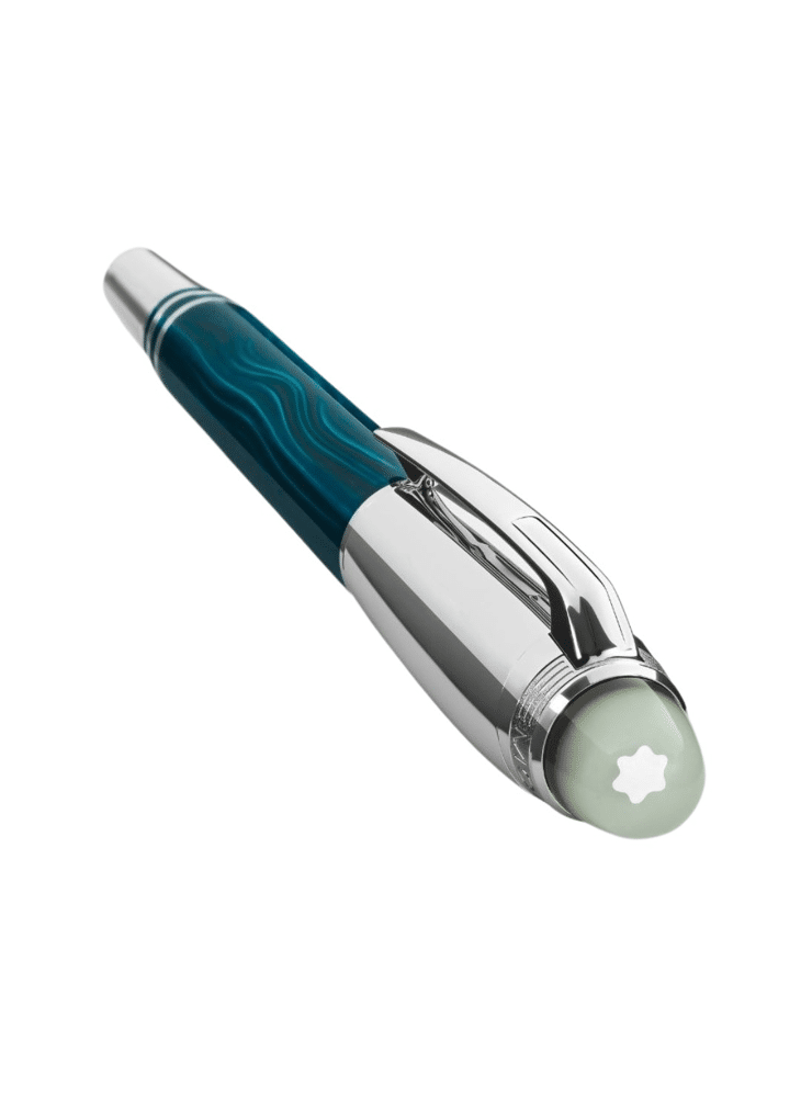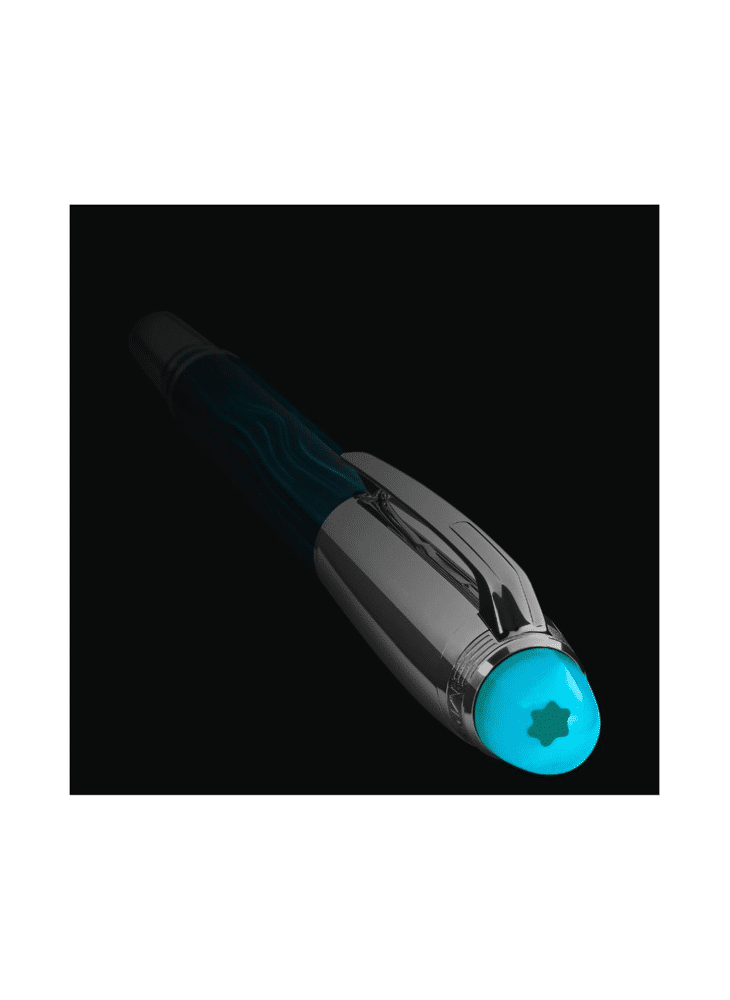 De Starwalker Polar Green pennen brengen de schoonheid van het noorderlicht tot leven. Op aarde kunnen mensen naar de hemel kijken en zich laten meevoeren naar wonderbaarlijke werelden terwijl ze getuige zijn van dit grandioze schouwspel. De koepel op de dop is gemaakt van transparante hars en gloeit in het donker, wat doet denken aan de betoverende, dansende aurora’s aan de nachtelijke hemel. Het guilloche patroon op het lichaam geeft op prachtige wijze de spectrale glans van het noorderlicht weer, en de donkergroene laklaag accentueert de passende reflecties. De vulpen is voorzien van een platina gecoate dop, clip en ringen. De handgemaakte 14 karaats gouden penpunt heeft een elegante rhodium coating.