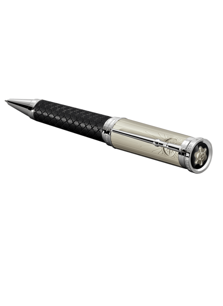 De Montblanc Writers Edition is opgedragen aan de fantasierijke verhalenverteller Robert Louis Stevenson, geboren in 1850 in Edinburgh, Schotland. Hij had twee grote verlangens: vrijheid en zich onderdompelen in andere werelden. Hij schreef essays en reisverhalen, maar ook zijn legendarische avontuurverhalen, met markante personages waarvan de namen, lezers over de hele wereld de rillingen over de rug doen lopen: Long John Silver, Capitain Flint, Jekyll en Hyde. De roman Schateiland vormde de inspiratie voor deze Writers Edition Homage to Robert Louis Stevenson Limited Edition 1883. De algemene vorm van de pen en de ringen op het lichaam creëren samen de indruk van een historische, uitschuifbare verrekijker. Het lichaam van de pen is gemaakt van edelhars en versierd met gegraveerde kruisen, waaronder een grotere “X” zoals die de locatie van een schat markeren op een landkaart. De verticale lijnen op de dop van deze Writers Edition doen denken aan de houten planken van de schoener Hispaniola. Achter de platina gecoate clip komen de lijnen samen in een kompasroos, terwijl de vorm van de clip verwijst naar een korvijnagel. De bovenkant van de dop wordt bekroond door het iconische Montblanc embleem met het piraten symbool. De ring van de dop is versierd met een gravure van Stevesons handtekening en de publicatiedatum van zijn eerste werk in 1886.